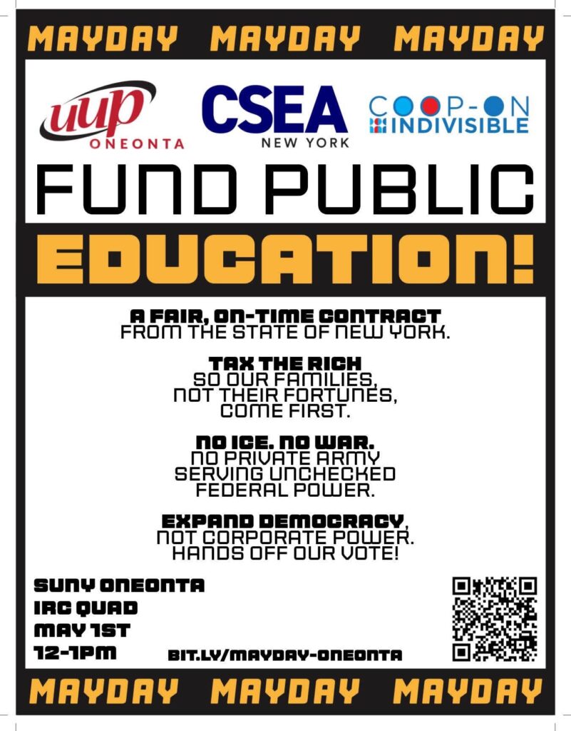MAY DAY Rally and Economic boycott, Friday May 1st, 2026, noon – 1 pm, at SUNY Oneonta main quad. Celebrate and stand up for all workers’ rights and demand a fair economy!